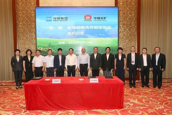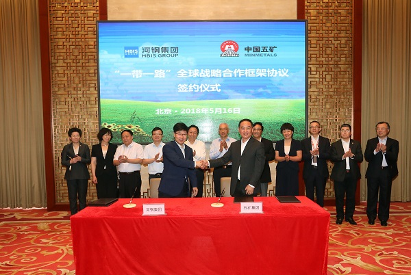 On May 16, the signing ceremony of the “Belt and Road” global strategic cooperation framework agreement between China Minmetals Corporation (China Minmetals) and HBIS Group Co., Ltd (HBIS) was held in Minmetals Plaza, Beijing. Witnessed by China Minmetals’ Chairman and Party Group Secretary Tang Fuping and HBIS Chairman and Party Secretary Yu Yong, China Minmetals Senior Vice President and MCC President Zhang Zhaoxiang and HBIS Vice President Liu Jian signed the strategic cooperation agreement on behalf of the two sides, respectively.