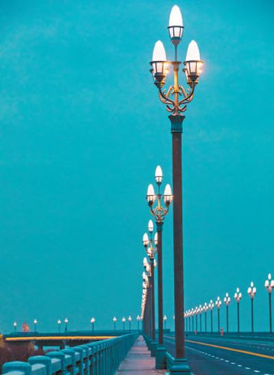 定制LED光源,照明强度提高10倍,整体能耗节约80%;花中主灯、辅灯可任意组合开关灯,根据交通流量关闭主灯,又能降低20%电能消耗;见光不见灯,三面红旗在光影艺术下动感飘扬,桥头堡上却不打一颗钉。