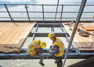 南京长江大桥桥高24米,约合8层楼,其下是每隔数分钟就通行一列火车的京沪铁路,再下面则是深不可测的滔滔江水。项目总工程师娄松介绍,为确保铁路运行安全,改造时设置了长达2030.3米、宽约21米的铁路防护棚架。