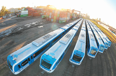在阿根廷,2013年,中车四方赢得总计709辆、金额近10亿美元的城际动车组供货合同,这是迄今为止我国最大的城际动车组出口订单。这些“青岛造”城际动车组目前已全部交付阿方,在布宜诺斯艾利斯的萨缅托、米特雷和罗卡三大城铁线上运营。“青岛造”列车技术先进、设施完善,每天奔跑在首都核心区与周边卫星城之间,服务上百万阿根廷人,赢得当地民众的喜爱,阿方提供的乘客满意度调查结果高达97%,成为一张张流动的“中国名片”。