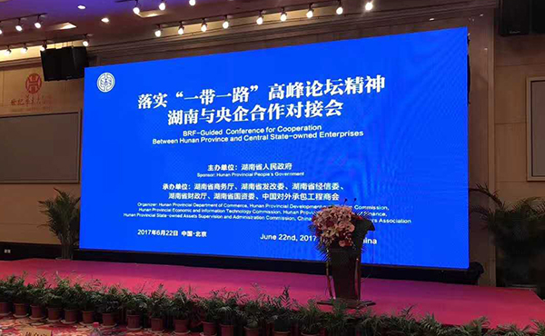 6月22日,由湖南省政府举办的“落实‘一带一路’高峰论坛精神 湖南与央企合作对接会”在北京举行。湖南省委副书记、省长许达哲,副省长何报翔、张剑飞等出席会议。国务院国资委党委书记郝鹏出席会议并致辞,商务部国际贸易谈判代表兼副部长傅自应、中央纪委驻工业和信息化部纪检组组长郭开朗、财政部副部长史耀斌出席会议。中国五矿集团公司总经理、党组副书记,中冶集团董事长、党委书记国文清,中国五矿副总经理、党组成员李福利、张兆祥代表中国五矿出席会议。
