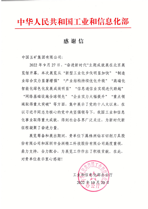 近日,工业和信息化部向中国五矿集团有限公司发来感谢信指出,在“奋进新时代”主题成就展展览筹备和展出期间,中国五矿所属企业高度重视、鼎力支持、全力配合,为展览工作作出了积极贡献。