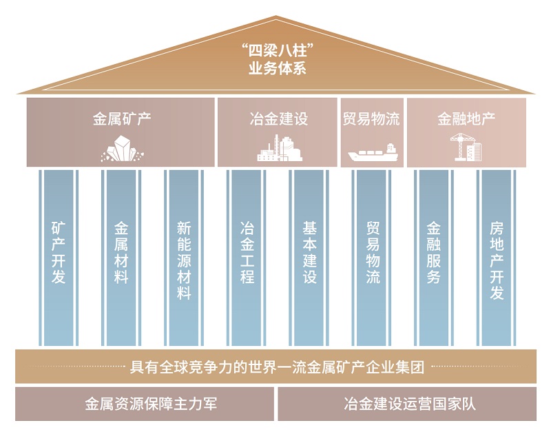 目前,中国五矿旗下有8家上市公司,拥有以金属矿产、冶金建设、贸易物流、金融地产为“四梁”,以矿产开发、金属材料、新能源材料,冶金工程、基本建设,贸易物流,金融服务、房地产开发为“八柱”组成的“四梁八柱”业务体系。