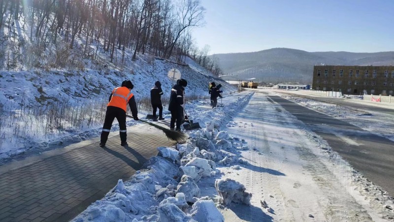 勘查公司龙江石墨项目员工正在清扫积雪