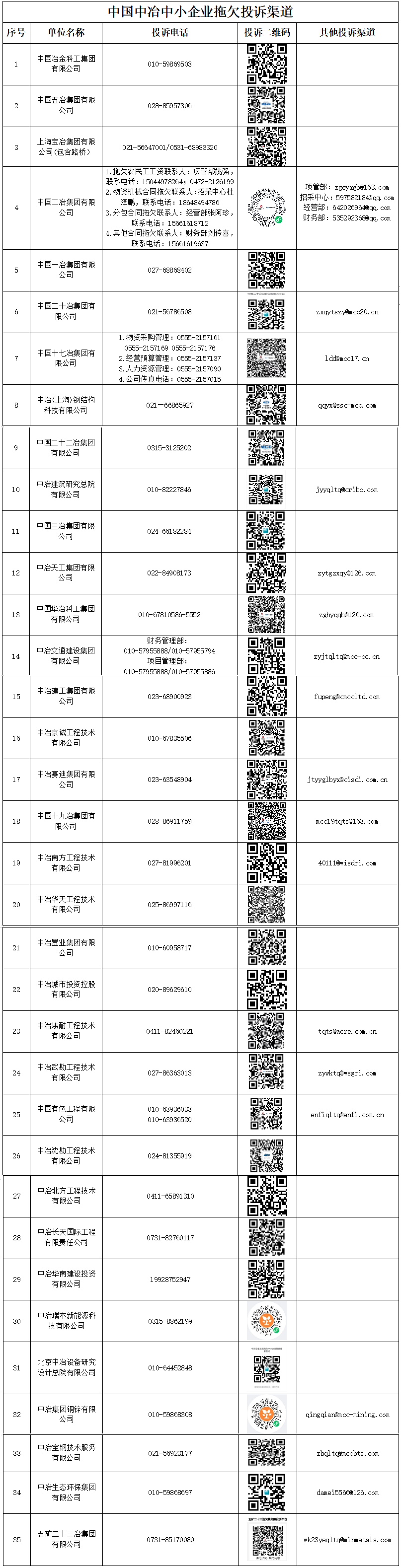 为提升投诉问题的针对性,切实提高办理效率,现公告中国中冶及所属各子公司联系方式: