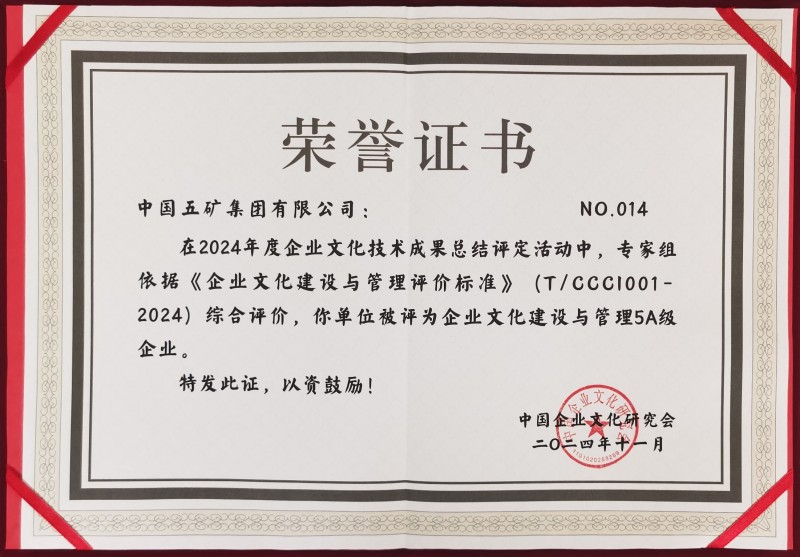 This selection strictly followed the Evaluation Standards for Corporate Culture Building and Management (T/CCCI001-2024), and included such procedures as case application, research and interviews, questionnaire surveys and expert reviews. China Minmetals stood out from all central state-owned enterprises and local enterprises participating in the selection by virtue of its outstanding performance in organizational building, concept creation, implementation & operation, publicity & communication of corporate culture, and its integration into operation and management. In this selection, China Minmetals, together with Aviation Industry Corporation of China, Ltd., China National Petroleum Corporation, China Southern Power Grid, Ansteel Group Corporation Limited, China Baowu Steel Group Corporation Limited and other enterprises, were included in the list of the first batch of "5A Grade Enterprises for Corporate Culture Building and Management" in China.